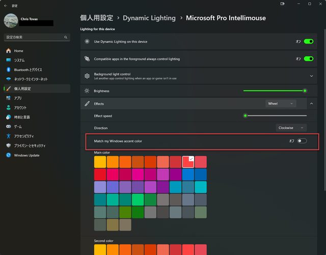 在裝置的燈條選項中,提供與Windows主題配對的選項