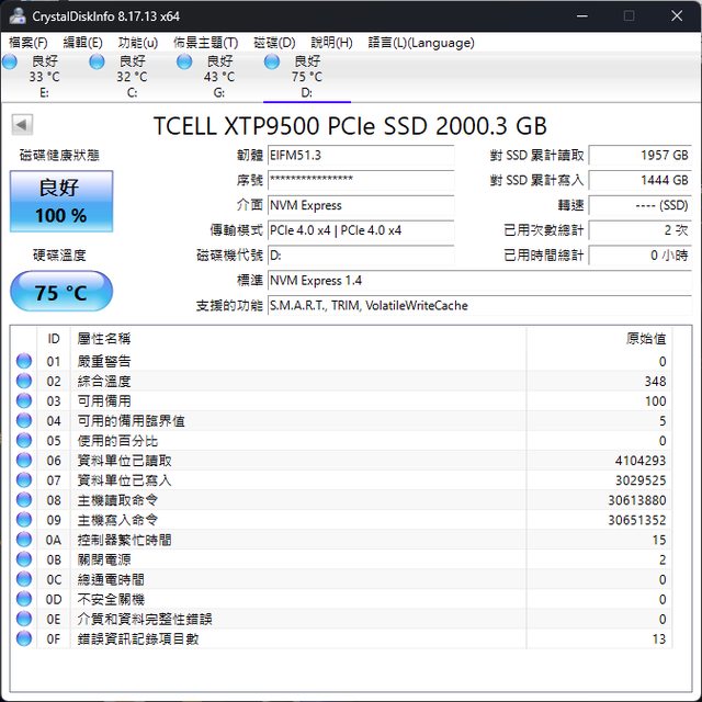 型號:TCELL XTP9500 2000GB M.2 2280 PCIe Gen 4x4