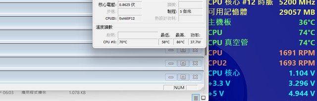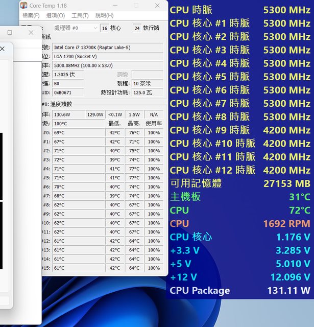 CPU TEST 最高溫度 72-77 時脈 P core 5.3G E Core 4.2G