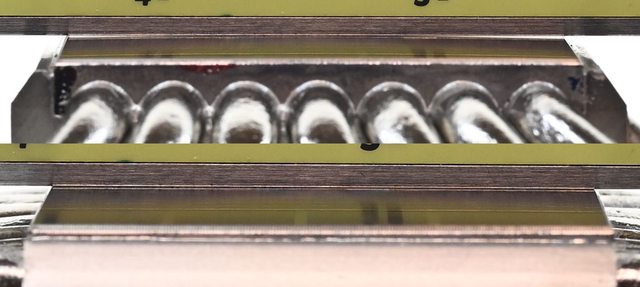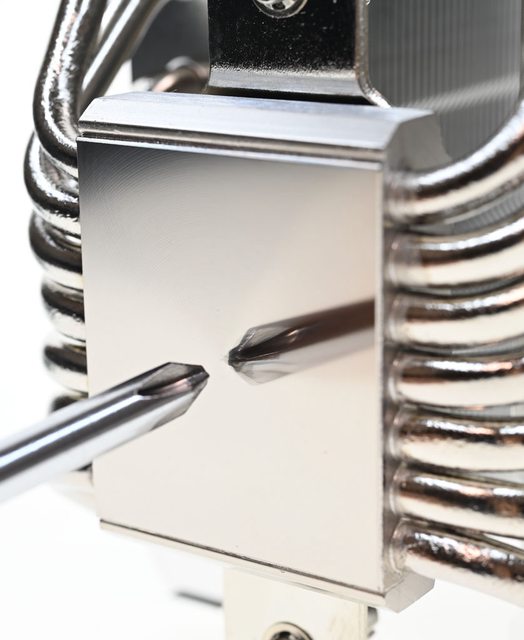 片裁切處理,表面鍍鎳的C1100純銅製處理器接觸面和7支直徑6mm無重力熱導管之間採用