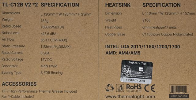 TL-C12B V2風扇,讓氣流充分通過前塔及後塔散熱鰭片。隨附TF-7高品質散熱膏及1對2風