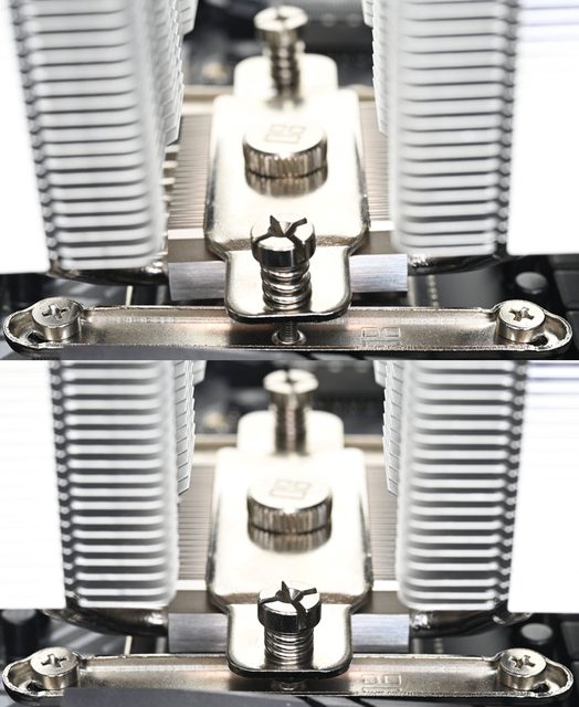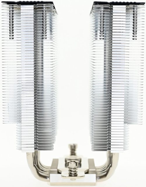 ▼從側面看,前塔及後塔下方10片散熱鰭片縮小,提供記憶體閃避空間,壓板中間用1個