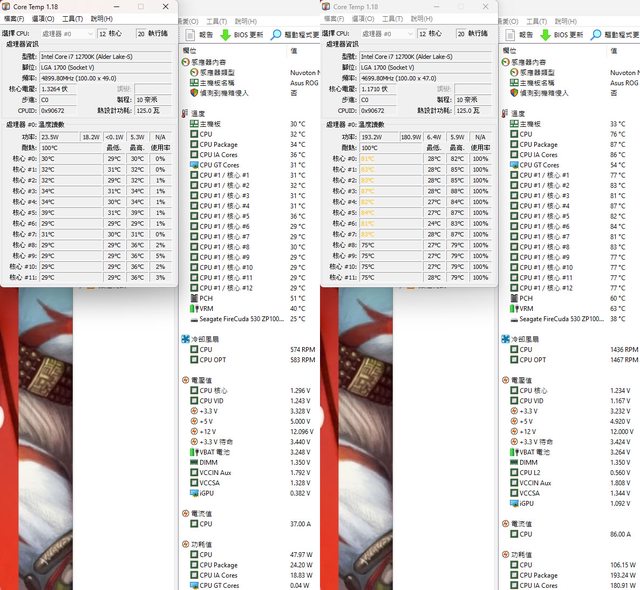 ▼待機(左)及高負載(右)的CORE TEMP及AIDA64感測器畫面