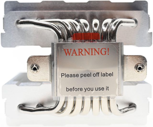 ▼散熱器底座的處理器接觸面有保護貼,上面用英文標示”警告!使用前請撕除保護貼”