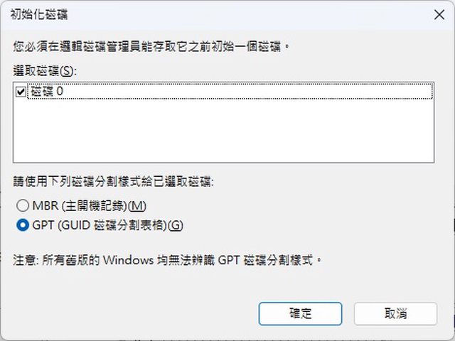 進入OS,會跳出初始化磁碟,選GPT