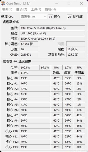 一般應用滿載CPU溫度50-55度,功耗為 100W