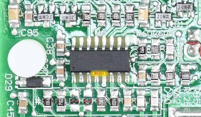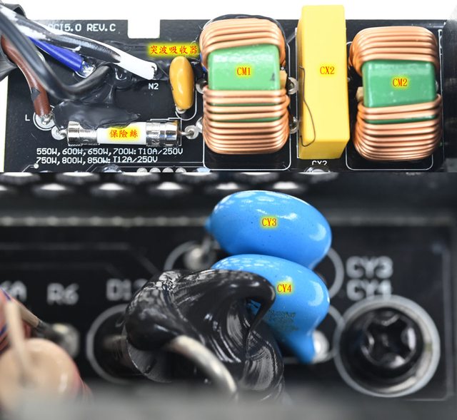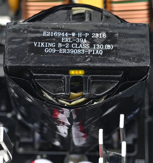 ▼主電路板上有2個共模電感(CM1/CM2)、1個X電容(CX2)及2個Y電容(CY3/CY4),臥式安裝