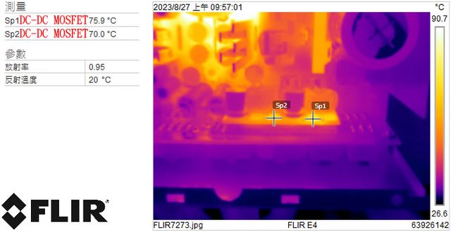 ▼電源供應器滿載輸出下DC-DC MOSFET的紅外線熱影像圖(附註:安裝位置環境溫度會影