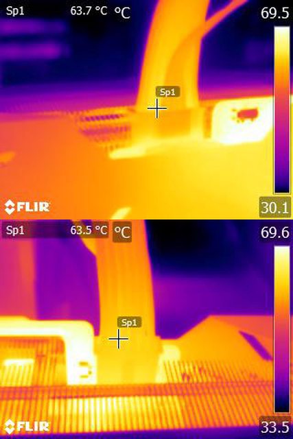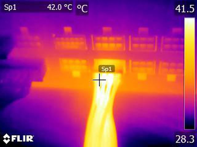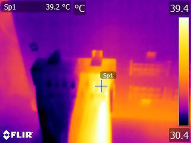 ▼執行FURMARK 30分鐘後電源端插頭的紅外線熱影像圖(附註:安裝位置環境溫度會影響