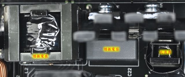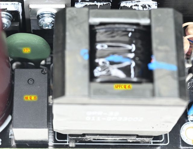 ▼封閉磁芯APFC電感旁的NTC熱敏電阻用來抑制輸入湧浪電流,電源啟動後會使用繼電器