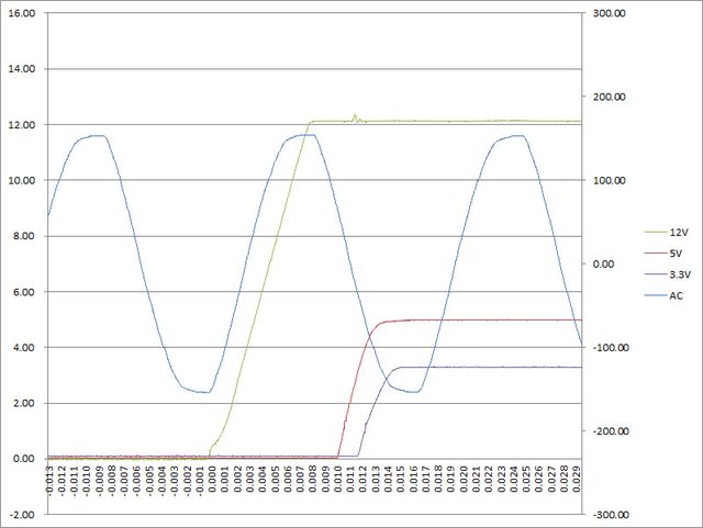 從12V開始上升處當成起點(0.000s)時,12V上升時間為8ms,5V上升時間為3ms,3.3V上升