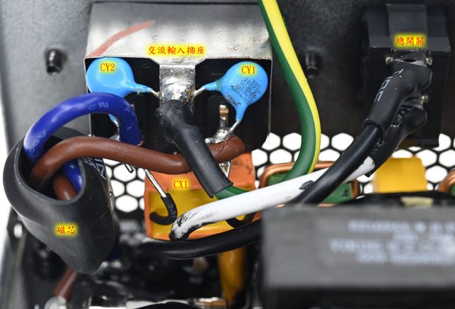 ▼交流輸入插座焊點加上2個Y電容(CY1/CY2)及1個X電容(CX1),磁芯、總開關焊點及X電