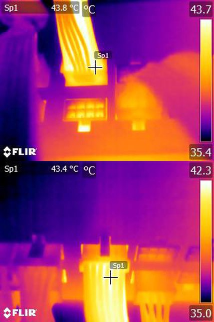 ▼單條PCIE 6+2P連續輸出21A(252W)10分鐘後的電源端模組化接頭紅外線熱影像圖(附註