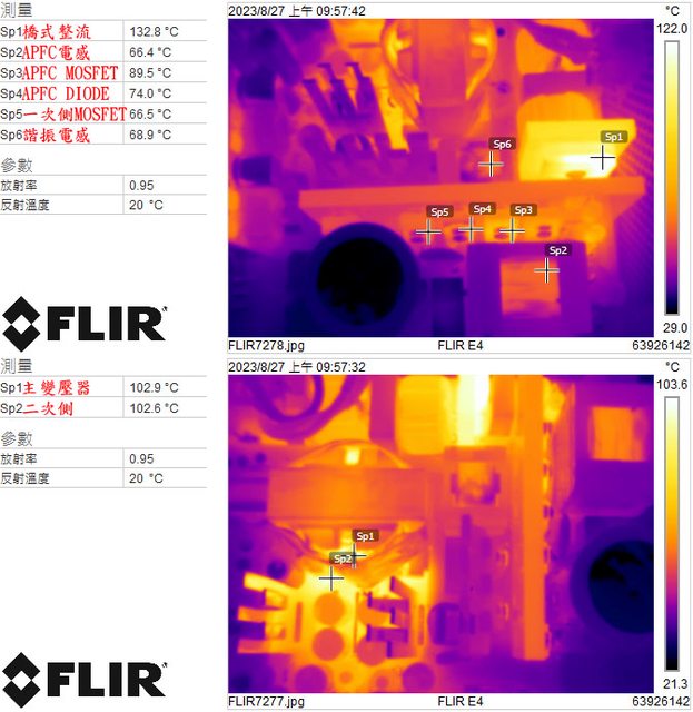 振電感(上圖)及主變壓器/二次側(下圖)的紅外線熱影像圖(附註:安裝位置環境溫度會影