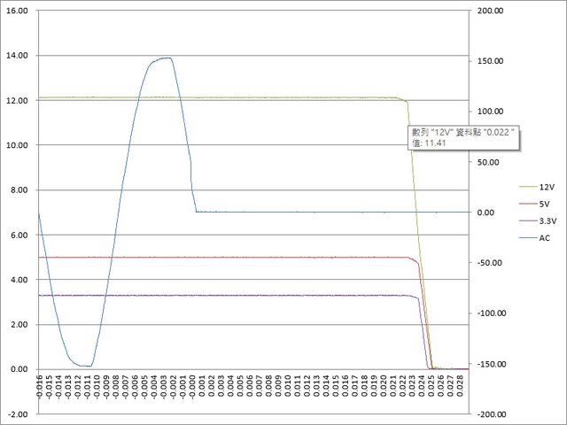 ○綜合全負載輸出狀態切斷AC輸入模擬電力中斷,12V於22ms降至11.41V