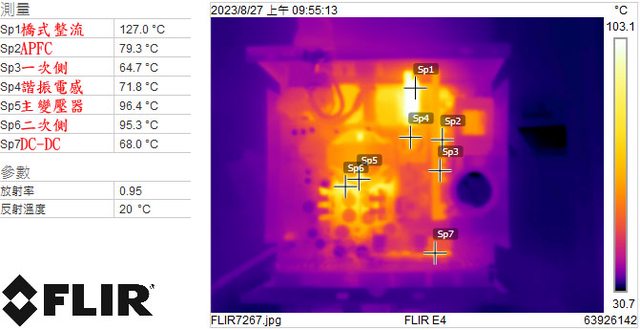 ▼電源供應器滿載輸出下內部的紅外線熱影像圖(附註:安裝位置環境溫度會影響測試結
