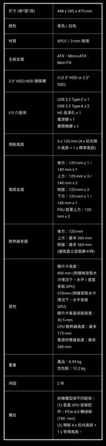 機殼本身為 ATX 中塔尺寸,實際為 448 x 245 x 475 mm,出廠時已經預先搭載了 5 顆 12