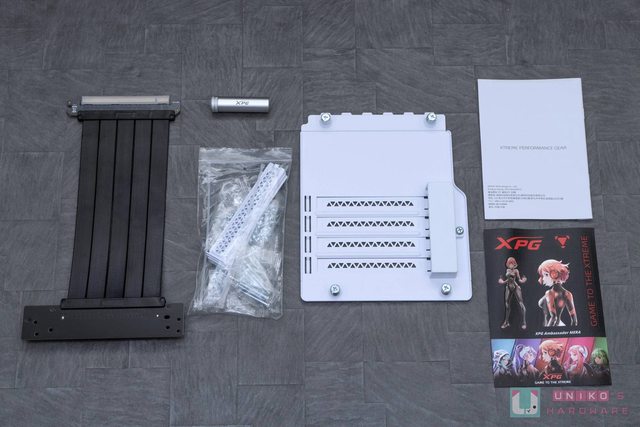 外提供 PCIe 4.0 延長線、顯示卡垂直安裝支架、和水平安裝支撐架,其中支撐架的兩端皆