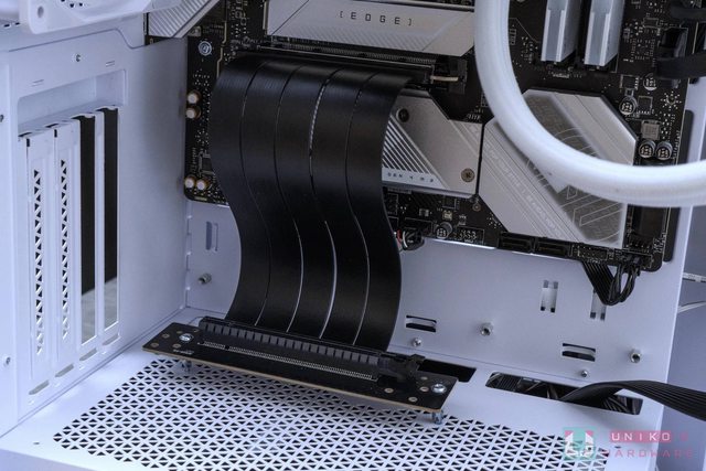 e 4.0 延長線,省去玩家還要額外購買的困擾,並且有 4 槽 PCIe 寬度可支援,水平部分
