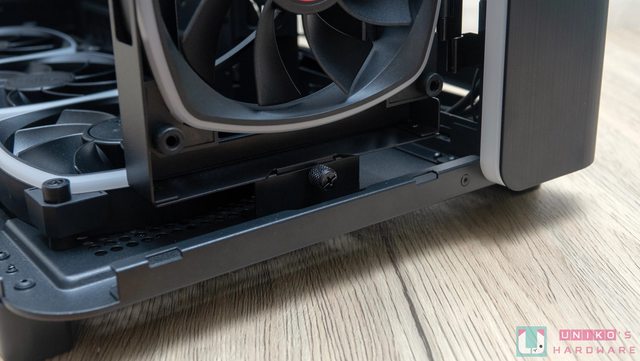 主機板艙的底部預裝 3 顆 RX120 ARGB 反向風扇 (同時支援 140 mm x 2),大量運用預裝
