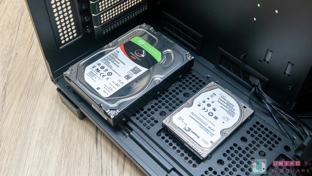 電源供應器安裝空間足夠,線材收納整理不是問題,上方預設裝的是可拆卸式硬碟安裝架,