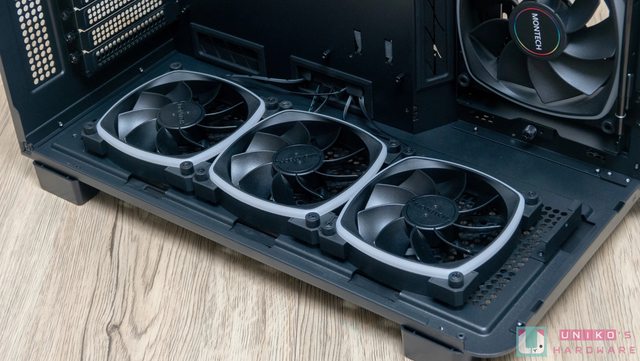 機殼底部預裝了 3 顆 RX120 PWM ARGB 反向風扇 (同時支援 140 mm x 2),若是前方使用