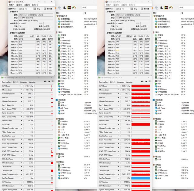接下來進行兩種安裝配置的CPU+GPU高負載前/後溫度比較
