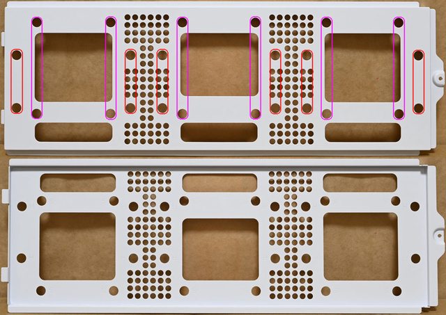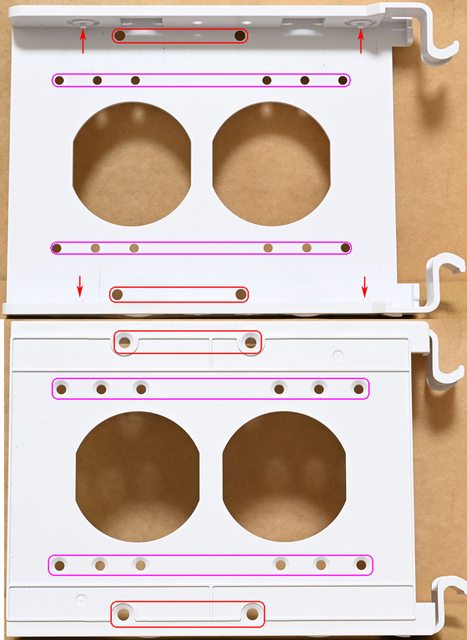 ▼右艙頂部有通風網孔,左艙頂部固定架兩側有4個螺絲(紅色箭頭),拆卸後可取下固定