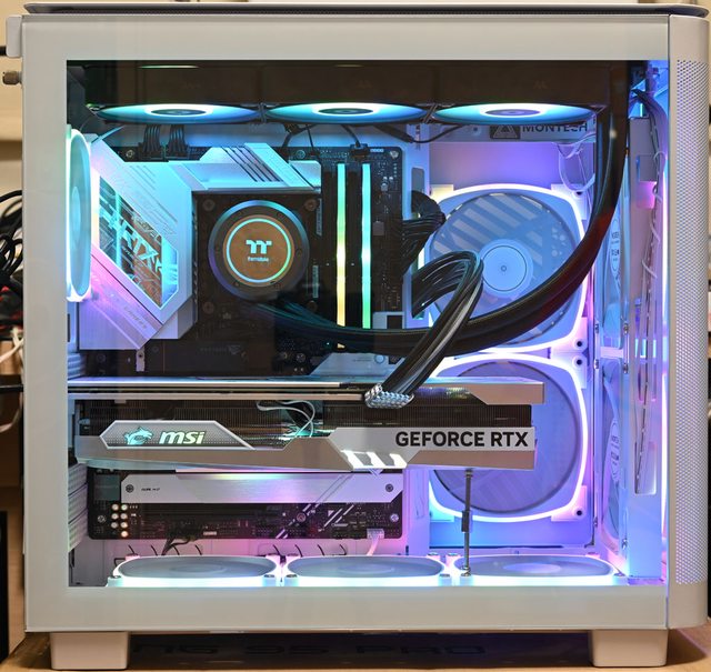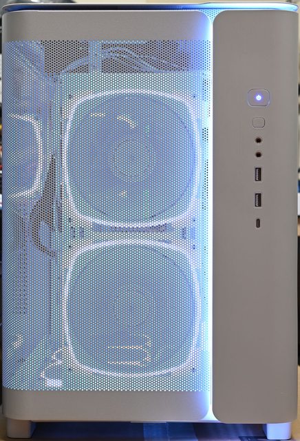 ▼正面安裝網孔板及加裝2個白色款AX140 PWM風扇時的正面燈光照明效果