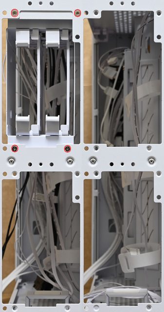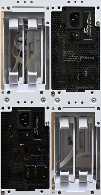 架安裝2個電源供應器。左艙底部未裝風扇時可安裝3.5吋/2.5吋固定架,可安裝3個3.5吋
