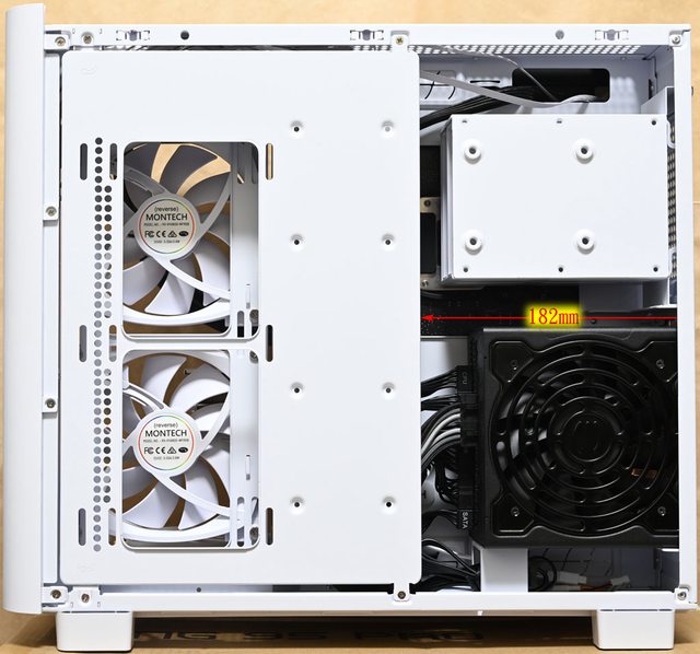 ▼裝上右艙風扇/2.5吋蓋板後,蓋板至後方的距離182mm,若電源本體長度超過180mm,就