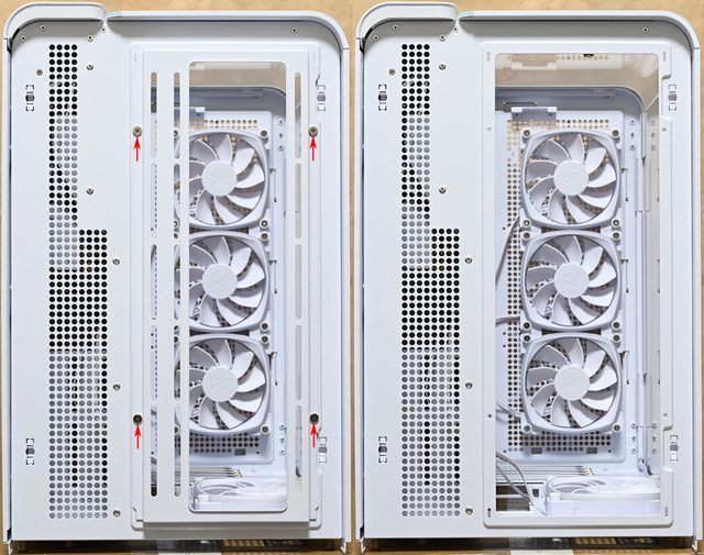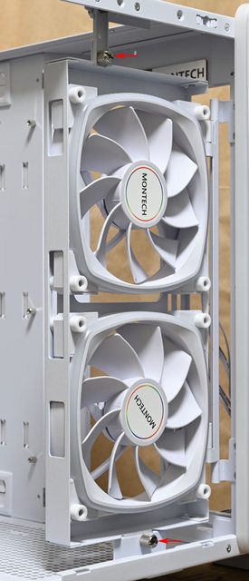 ▼右側前方固定架轉向至正面並加裝2個白色款AX140 PWM風扇時,可把原本2個白色款