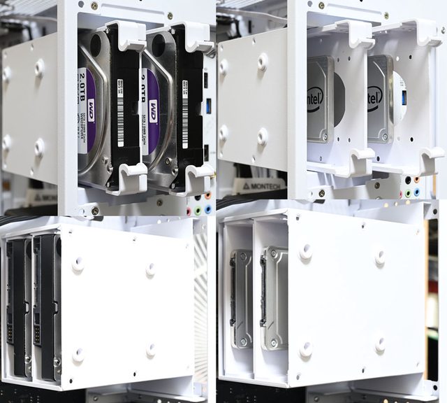 ○右艙可拆卸式固定架的托盤可從機殼後方抽取,可安裝2個3.5吋/2.5吋裝置,固定架外
