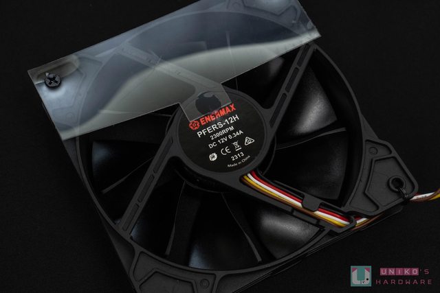 的 ENERMAX Logo 貼紙,四邊用十字螺絲固定。仔細看電供的話還會注意到周邊有獨特的磨