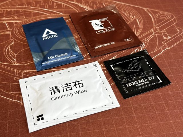 除了散熱膏還會加上各家清潔濕巾的使用心得,這次湊齊AC、利民、貓頭鷹及ROG四款清