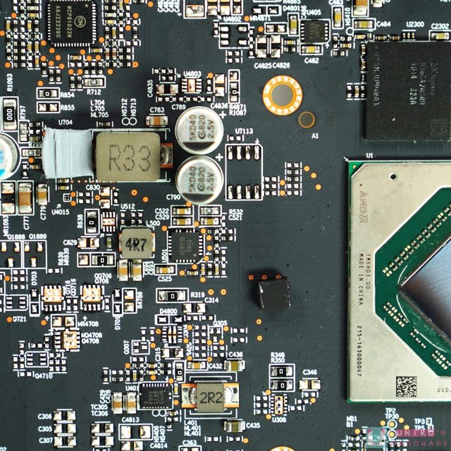 PCB 背後為金屬背板,提供散熱、保護、加固和美觀的功能。不得不提的是 SAPPHIRE 的黑
