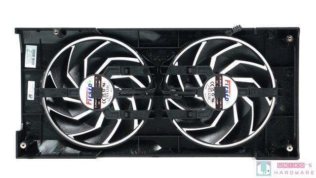 塑膠製的風扇外殼以 4 顆螺絲與金屬背板固定在一起,風扇被固定在風扇外殼上而非金屬