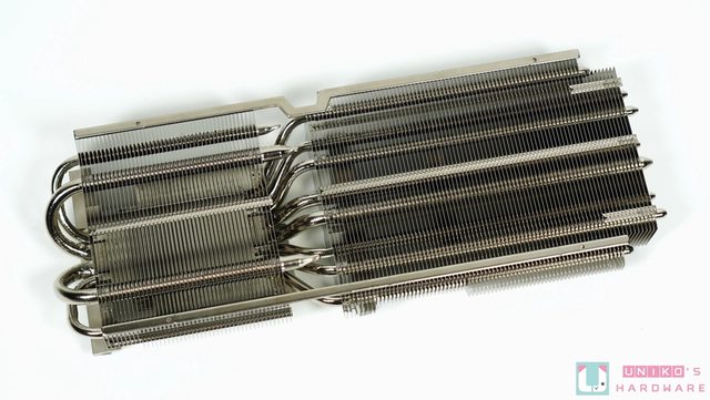 所有熱導管往比較大多鰭片的部份延伸,核心正上方的鰭片部份則有 4 根熱導管以 C 字形