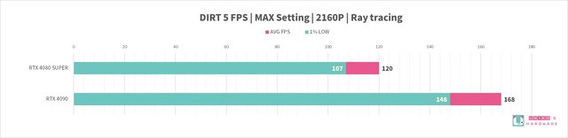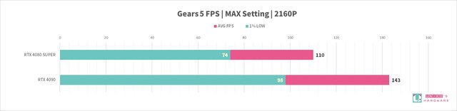 RTX 4080 SUPER 針對遊戲性能對比 RTX 4090,在 4k 2160P 解析度下,平均 FPS -22%,1