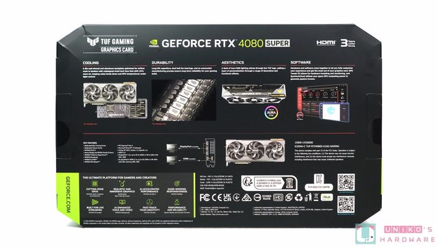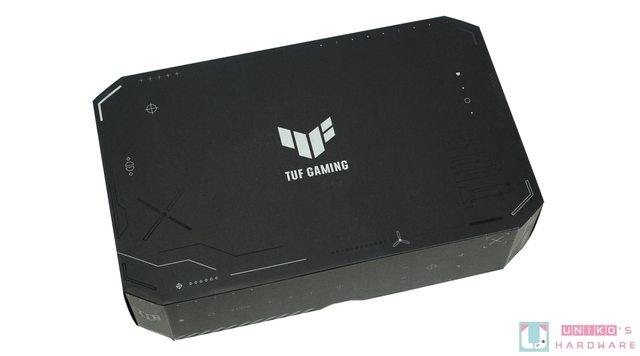 TUF GAMING GeForce RTX 4080 SUPER 繼續沿用 RTX 4080 時期的包裝設計,四角被削去的