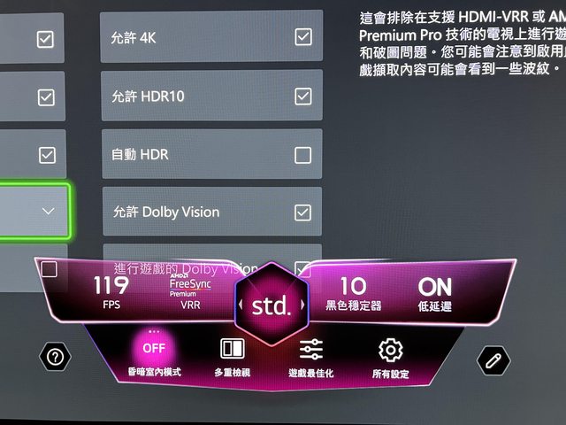 VRR是否開啟可以透過電視遙控器上的遊戲最佳化設定來確認