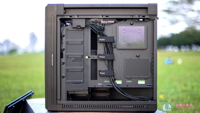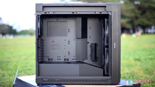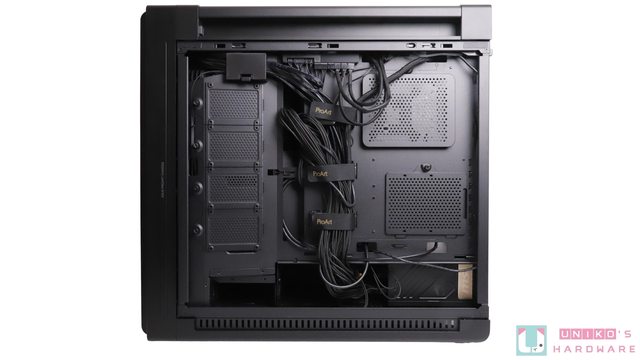 寬敞的空間,不管是電源供應器又或是 420 水冷都能輕鬆安裝,右側線材整線空間也十分