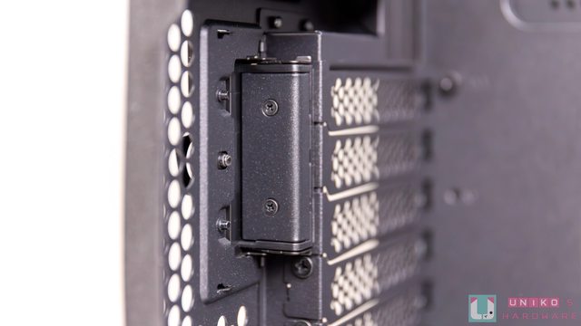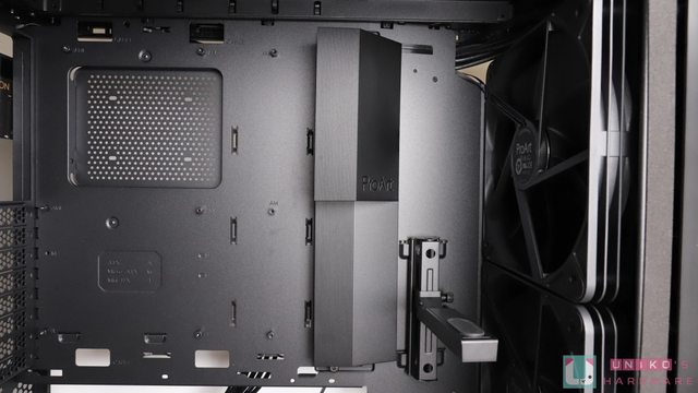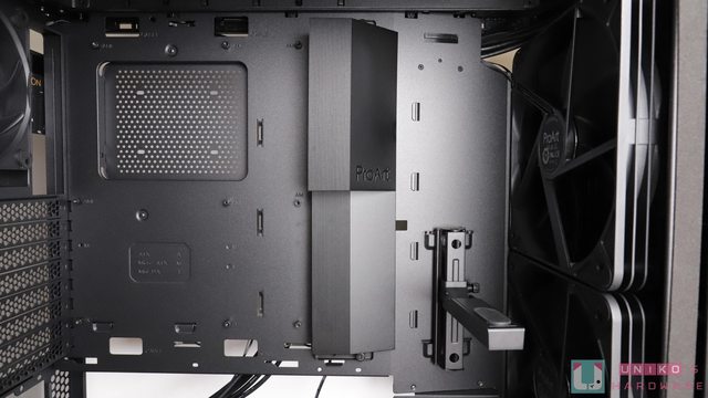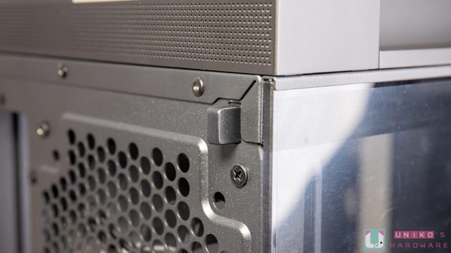 下方電源艙遮罩上留有 12VHPWR / 顯示卡電源走線孔,同時還有顯示卡直立鎖孔,電源供