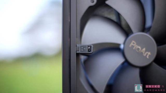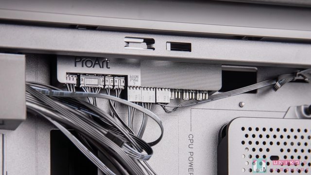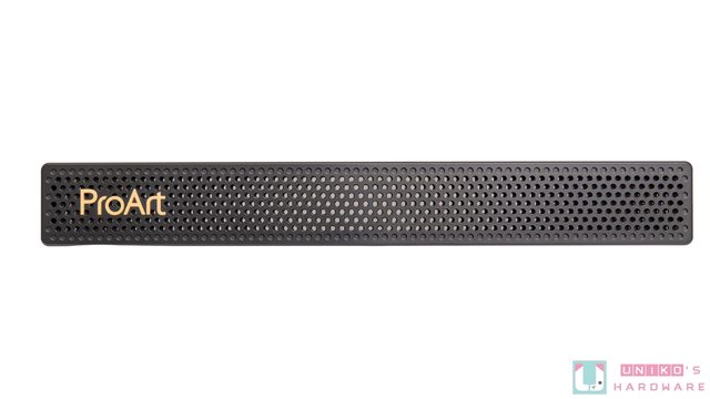 前面板採直條格柵設計,左下方有 ProArt 標誌,面板中還可以隱約看到 ProArt 的線條設