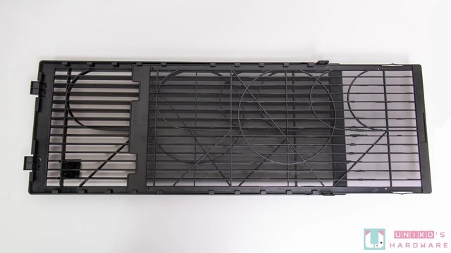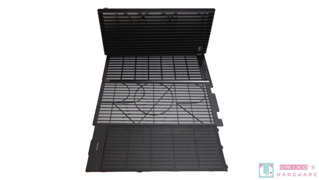 計。前、上、下及鋼化玻璃上都有設計的進氣散熱孔,也都配備抽取式防塵濾網,濾網皆採