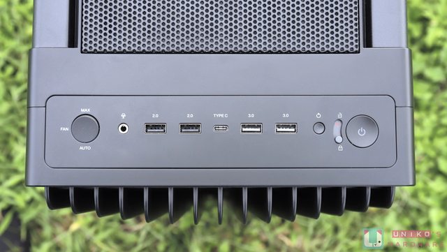 前方 I/O 面板由左到右分別是風扇控制鍵、3.5 mm 耳麥插槽、USB 2.0 Type-A x 2、USB