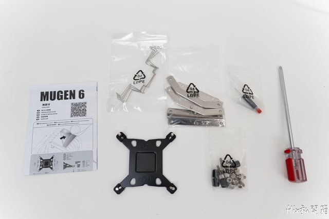 配件部份有風扇扣具、強化背板、CPU固定扣具及螺絲以及自家生產的散熱膏搭配塗抹用