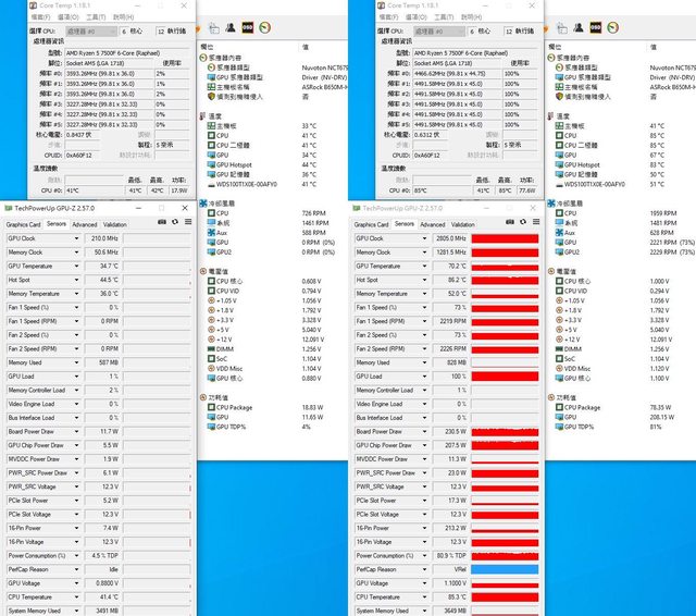 ▼平躺放置CPU+GPU高負載前(左)及高負載30分鐘後(右)的Core Temp、GPU-Z感測器、