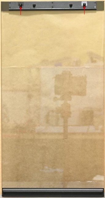 ▼正面強化玻璃背面,上緣塑膠條有2個押扣(紅色箭頭),下緣金屬條有插入式固定架