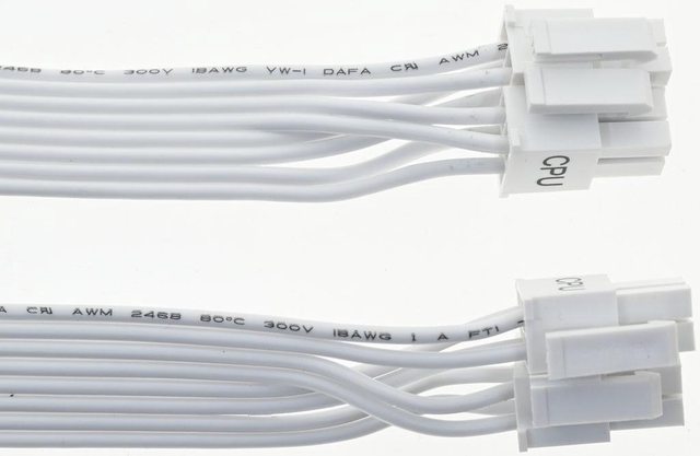 ▼2條處理器電源白色帶狀模組化線路,提供2個EPS 4+4P接頭,18AWG線路長度65公分